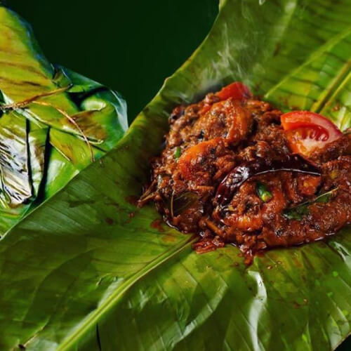 Prawns cooked in spicy masala, wrapped in banana leaf and steamed for rich flavor
