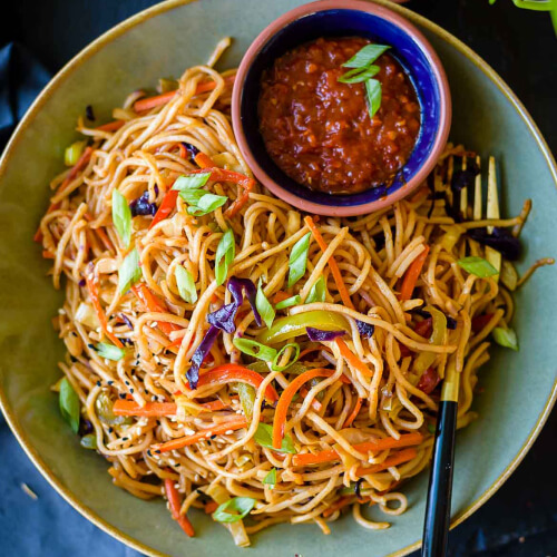 Stir-fried noodles with vibrant veggies, eggs, and a spicy Szechuan sauce for a bold flavor
